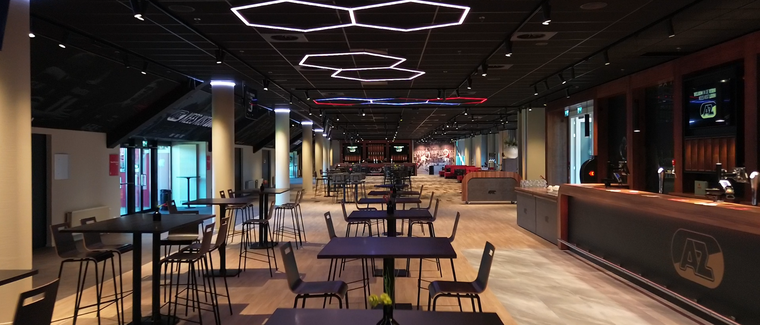 De ruimtelijke zaal beschikt over luxe loungebanken, moderne statafels met krukken en een eigen muziekinstallatie. De sfeervolle ruimte biedt plek tot 100 personen en is, indien gewenst, gemakkelijk te vergroten om meerdere gasten te ontvangen. Daarnaast is het mogelijk om vanaf het terras te genieten van het prachtige uitzicht op het hoofdveld.