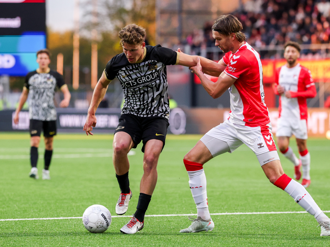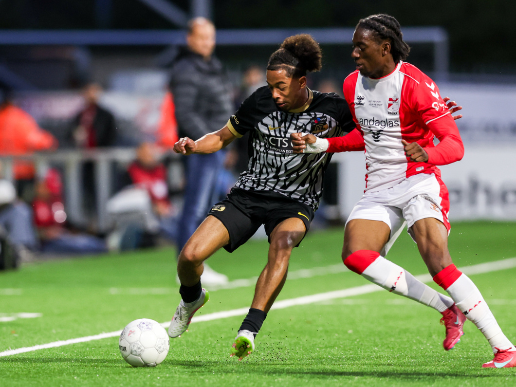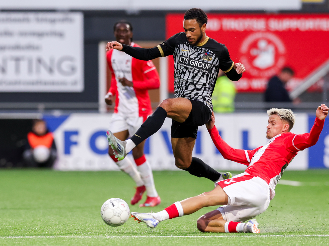 Het schot van Elijah Dijkstra wordt ternauwernood uit het Emmense doel gehouden, waarna Ro-Zangelo Daal wel raak schiet!