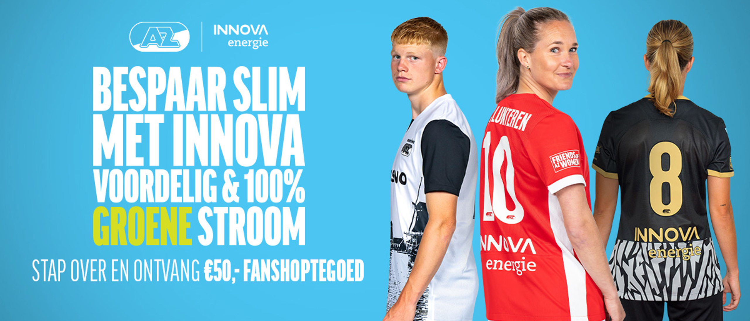 Bij Innova Energie krijg je betaalbare energieoplossingen inclusief 100% groene stroom voor particulieren en bedrijven. Als supporter van AZ profiteer je nu van een exclusieve aanbieding: het goedkoopste energieaanbod van Innova én €50 fanshoptegoed bij AZ!