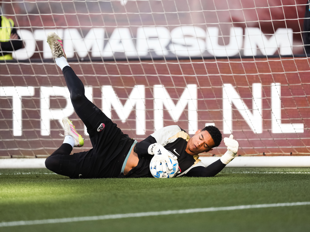 Doelman Unnerstall laat de bal los na een inzet van Mijnans. Deze rolt over de doellijn.