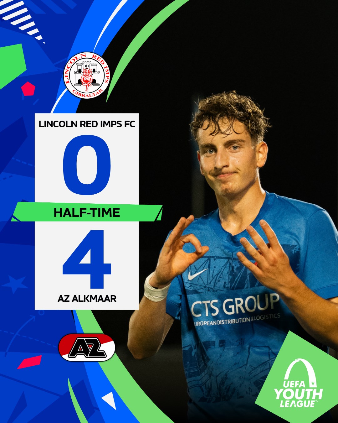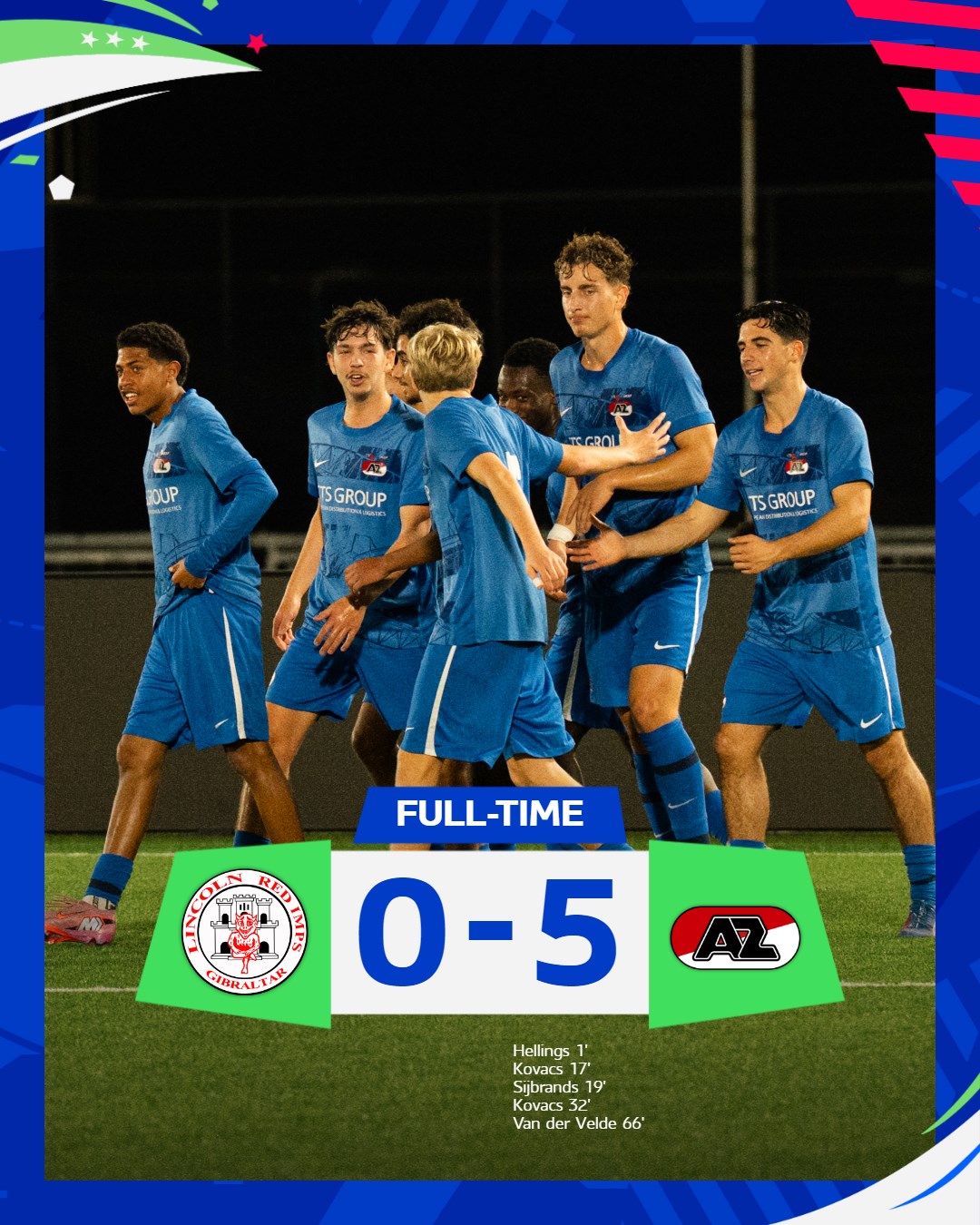 GIBRALTAR- AZ Onder 19 heeft dinsdagavond met 0-5 gewonnen van Lincoln Red Imps FC in Gibraltar. De thuiswedstrijd was al gewonnen met 4-0. De ploeg van hoofdtrainer Michael van Zijtveld plaatst zich hiermee voor de volgende ronde van de UEFA Youth League.