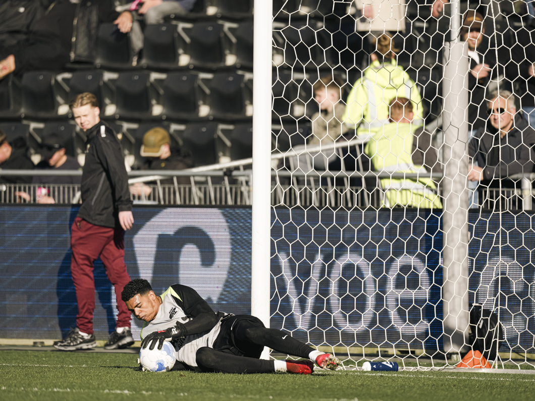 Na een scrimmage in de zestien wordt Rome-Jayden Owusu-Oduro voor het eerst getest. De doelman stopt de inzet van Victor Edvardsen.