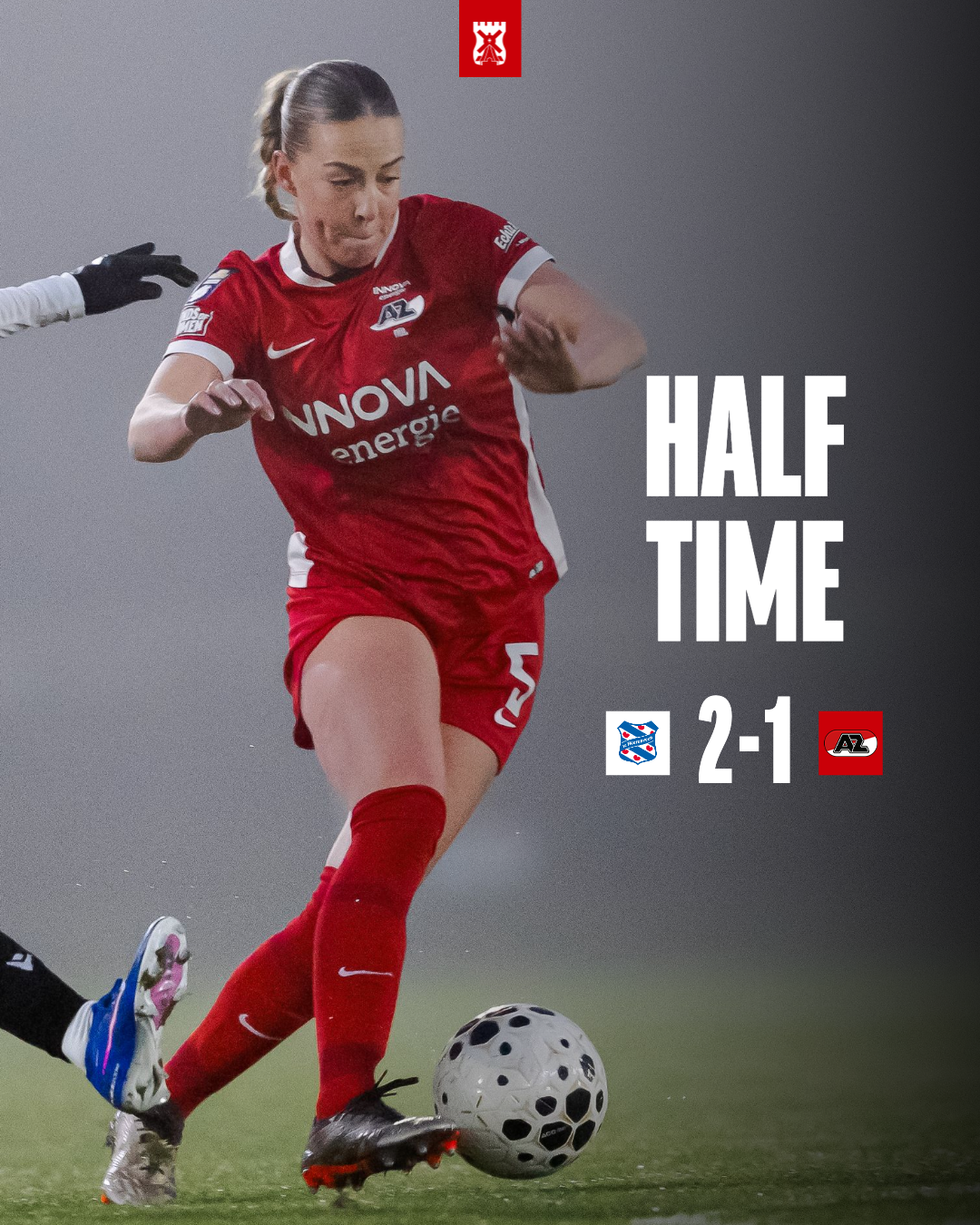 Na een periode zonder kansen, is de thuisploeg na 27 minuten spelen gevaarlijk met een afstandsschot van Evi Maatman, maar de poging belandt in de handen van AZ-keepster Netty Booms.