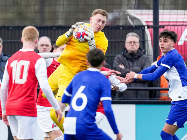 UTRECHT- In een waar spektakelstuk waarin liefst vier penalty's werden toegekend heeft Jong AZ maandagavond drie punten mogen bijschrijven. Rome-Jayden Owusu-Oduro keerde een strafschop, terwijl Nick Koster eentje benutte. Ro-Zangelo Daal verzorgde de andere treffer aan Alkmaarse zijde. Het werd 1-2 in Utrecht.