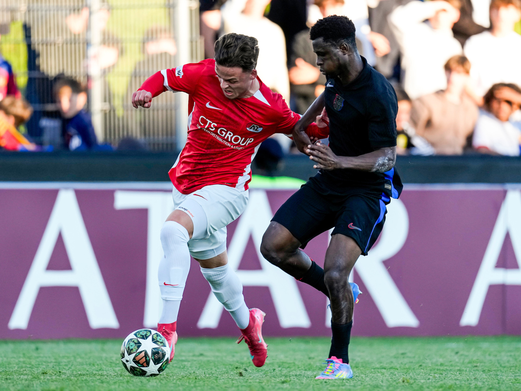 De Alkmaarse nummer 10 wordt aangespeeld door Boogaard en haalt uit, maar de inzet gaat ver over het Catalaanse doel.