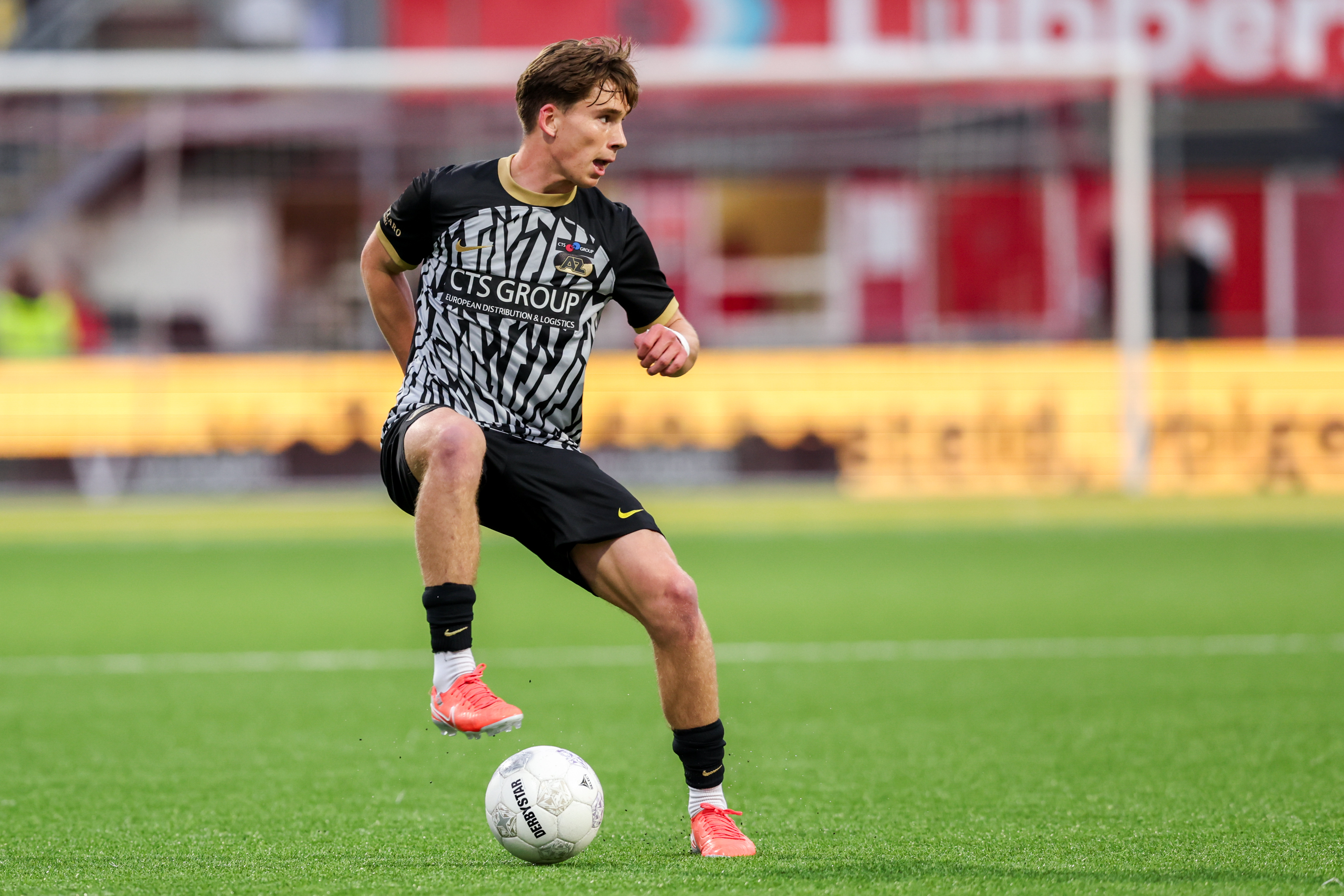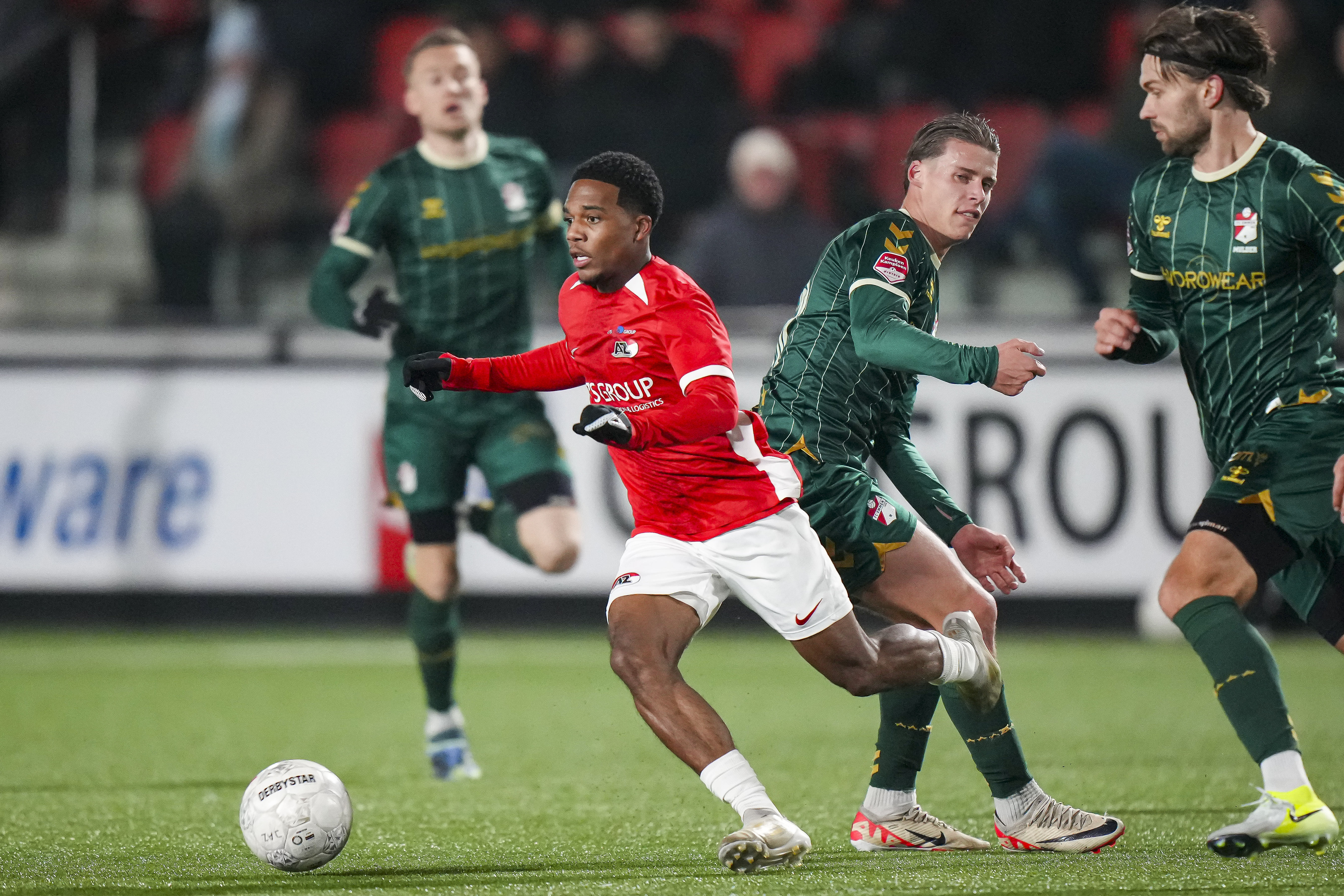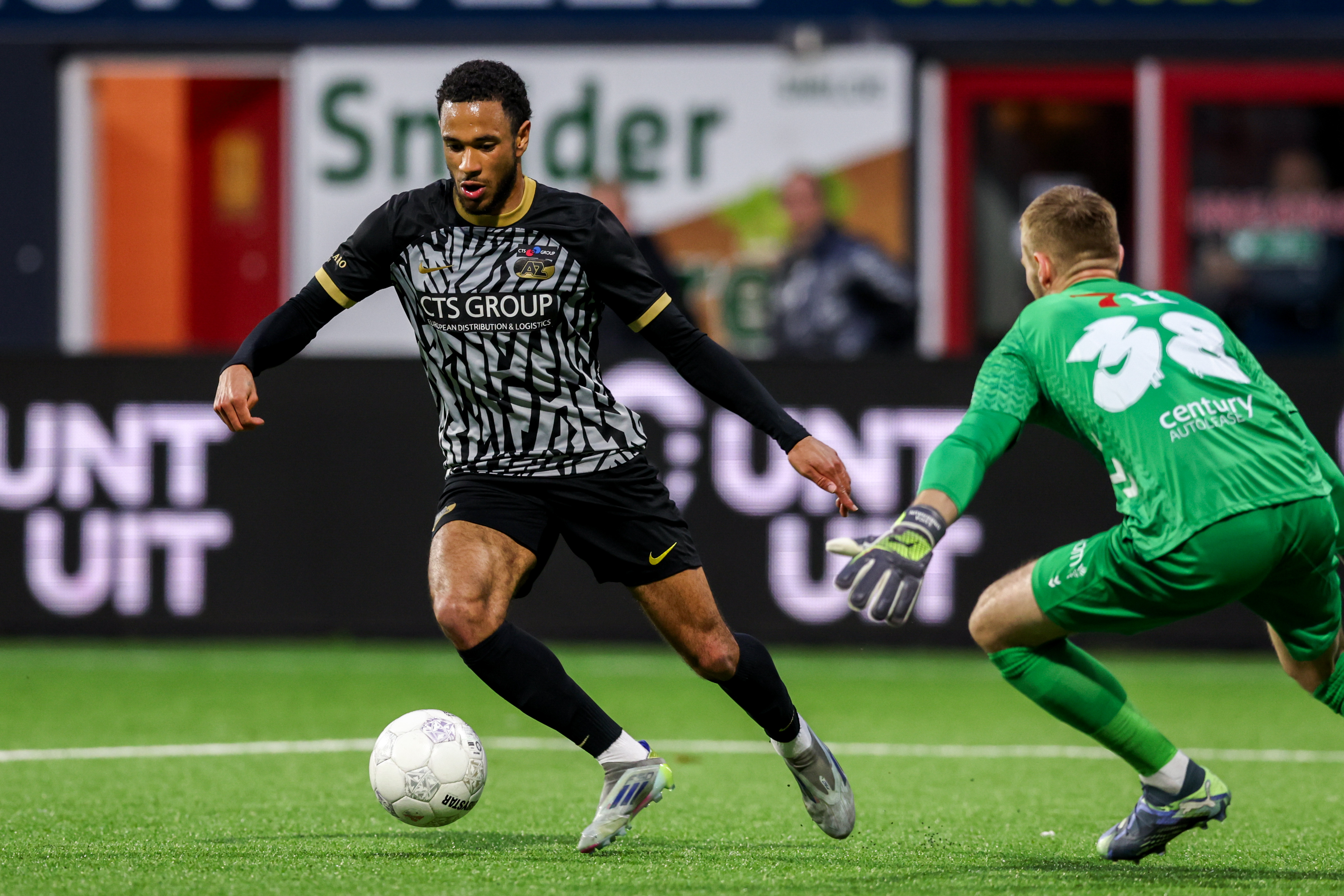 Hawkins wordt bereikt met een voorzet en schiet vervolgens in het zijnet van het Alkmaarse doel. Het blijft 0-1.
