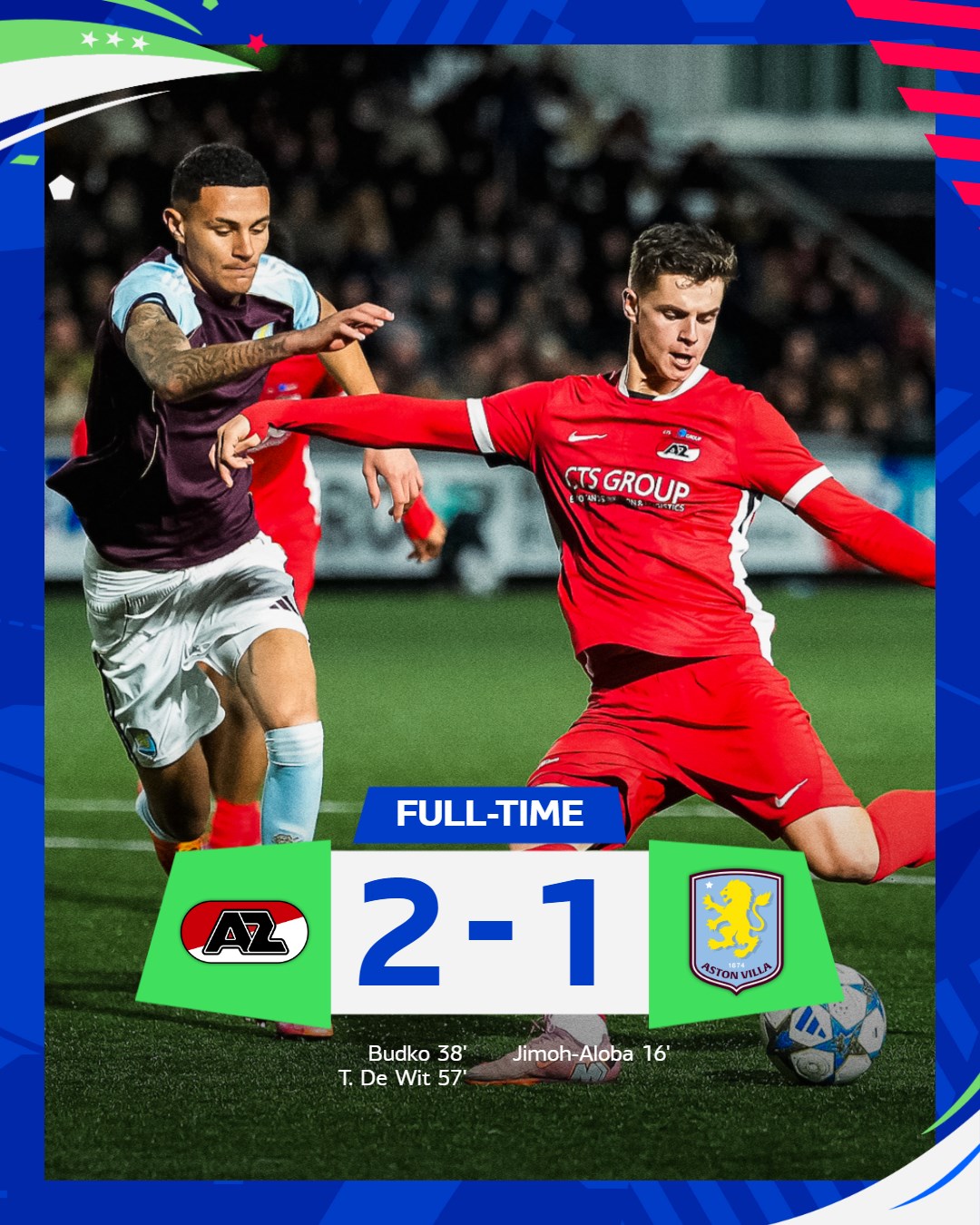 ZAANSTAD- AZ Onder 19 heeft zich geplaatst voor de volgende ronde van de UEFA Youth League. In de return tegen Aston Villa kwam de Engelse ploeg na een kwartier spelen op voorsprong. De formatie van Michael van Zijtveld toonde echter veerkracht: nog voor rust bracht Bohdan Budko de Alkmaarders langszij. Na de pauze besliste Tycho de Wit het duel met een rake treffer: 2-1.
