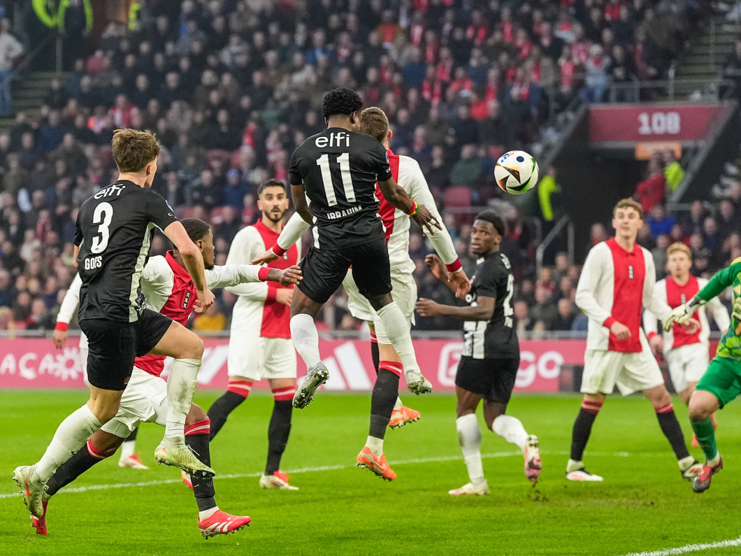 De Ajax-spits weet het doel niet te vinden en kopt naast.