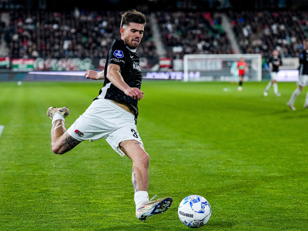 In de slotseconden van het duel haalt de spits uit, maar zijn schot gaat snoeihard tegen de Alkmaarse paal.
