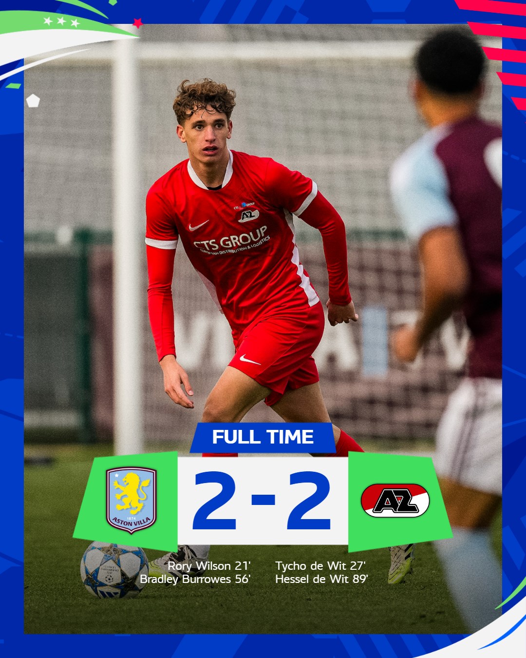 BIRMINGHAM- AZ Onder 19 heeft woensdagmiddag gelijkgespeeld tegen de leeftijdsgenoten van Aston Villa. De ploeg van Michael van Zijtveld kwam twee keer op achterstand, maar dankzij doelpunten de broertjes van Tycho en Hessel de Wit eindigde het duel in een 2-2 gelijkspel.