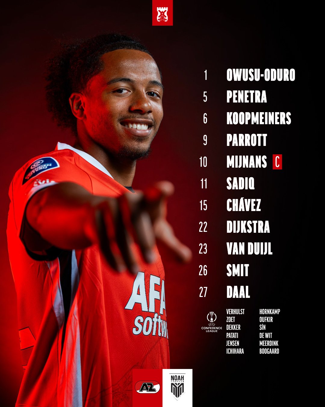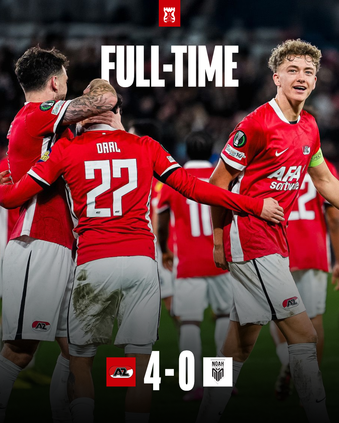 ALKMAAR- AZ boekte in eigen huis een overtuigende 4-0 zege op het Armeense FC Noah. Met dit resultaat bereikt de ploeg van hoofdtrainer Leeroy Echteld de achtste finales van de UEFA Conference League. Sven Mijnans kroonde zich tot Man van de Wedstrijd met twee doelpunten. In de volgende ronde neemt AZ het op tegen AEK Athene of Sparta Praag.