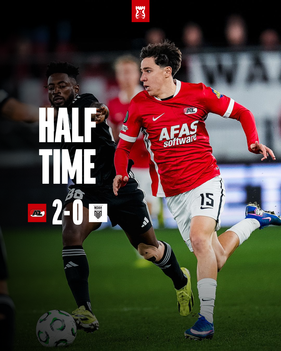 AZ speelt de bal rond die eindigt bij Peer Koopmeiners. De middenvelder schept de bal over de verdediging van FC Noah en bereikt Chávez, die de bal ongelukkig in de handen van de keeper kopt.
